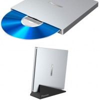 Достойным владельцам малых компьютеров - MacBook Apple - без оптического привода - компания Pioneer, настоятельно рекомендует внешний, утончённый BD -"резак" с щелевой загрузкой дисков - BDR-XU02JM! Величина памяти буфера гаджета - 4 Мбайта, коммутация с ноутбуком и его энергопитание, происходит через 1 кабель с разъёмом USB 2.0, для установки "резака" вертикально в комплекте предусмотрен специальный постамент!