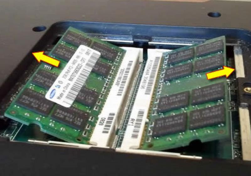 После того. Как крышка будет снята, вы увидите непосредственно платы оперативной памяти, их может быть две или одна, в зависимости от комплектации вашего ноутбука. Аккуратно разводим пластиковые фиксаторы в верхней части микросхемы, после этого платы должны выскочить из пазов и остаться в гнездах, выступая под углом примерно в 30 градусов. Аккуратно вытяните микросхемы, не меняя угла наклона, как показано на рисунке.